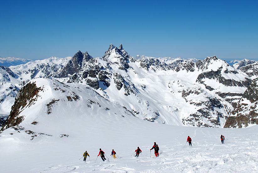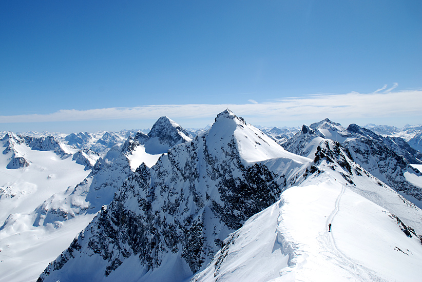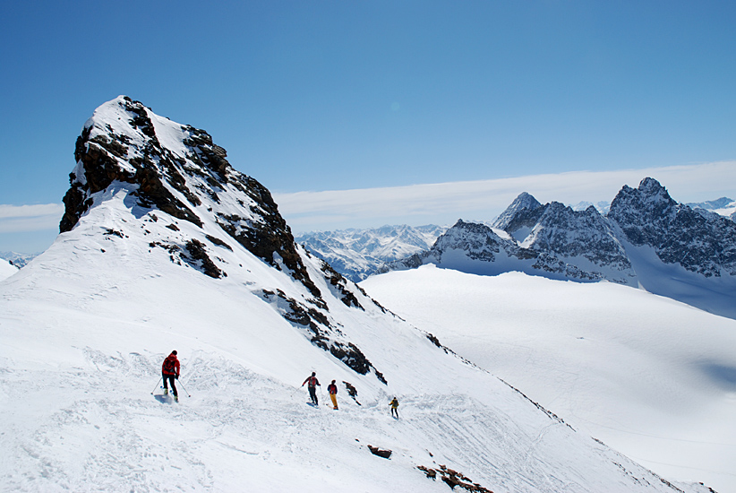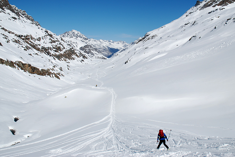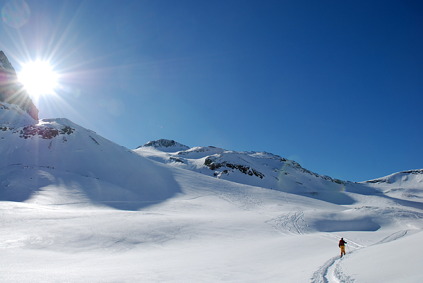 | Routenbeschreibung: | Unterhalb der Bielerhöhe auf die Staumauer und hinab zum ausgelassenen Silvrettastausee. Diesen entlang und am Ende rechtshaltend ins Klostertal. Unterhalb der Klostertaler Umwelthütte weitausholend auf die linke Seite des Klostertaler Gletschers und diesen empor Richtung Rothfluhlücke. Über den Steilhang in mehreren Spitzkehren auf den Bergrücken und weiter bis kurz unter den Gipfel. Die letzten Meter werden zu Fuß erklommen. Abfahrt über die steilen Westhänge ins Klostertal und wieder über den See mit mühsamen Aufstieg zur Staumauer. |