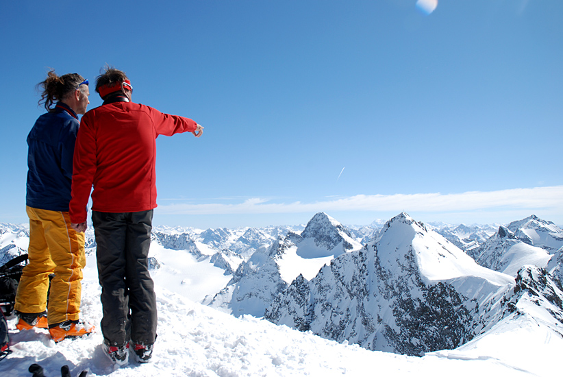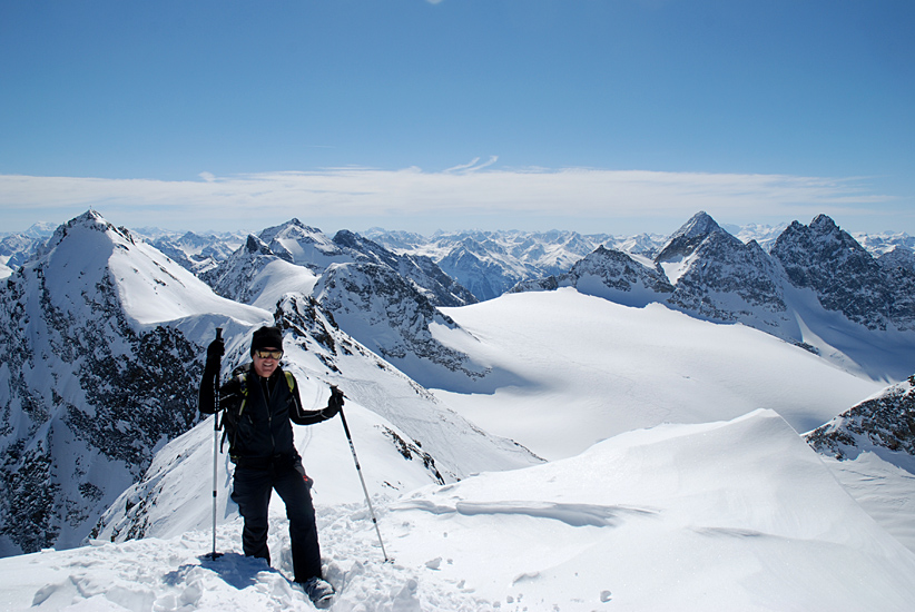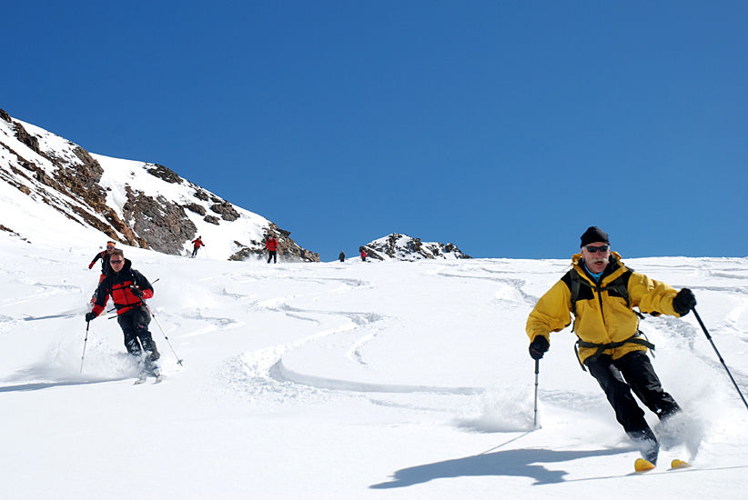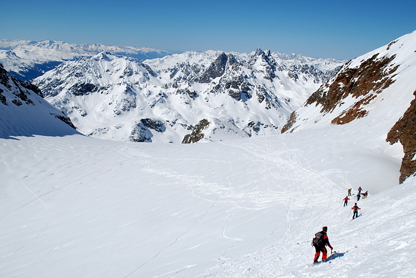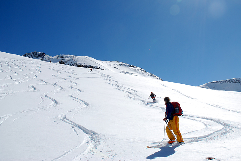 | Angetroffene Verhältnisse: | Aufgrund des frühen Aufstiegs hatten wir im oberen Teil schon herrlichen Firn und in den Westhängen noch feinsten Pulver |