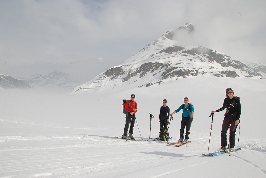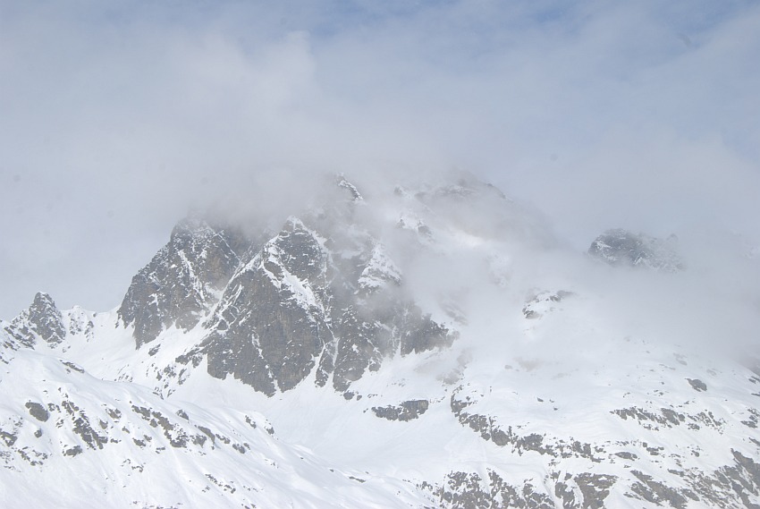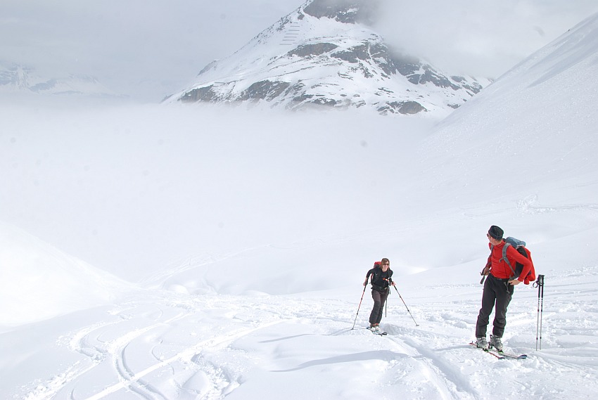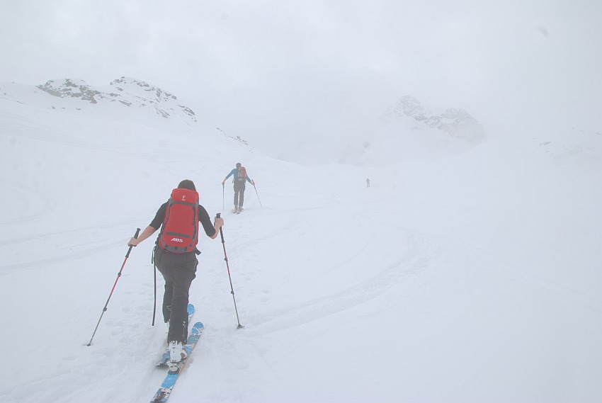 | Angetroffene Verhältnisse: | Anfangs noch gute Sicht. Aber der Mitte der Route dann zunehmend Wolkenaufzug vom Tal. Bei der Abfahrt miserable Sicht und Hartschnee |