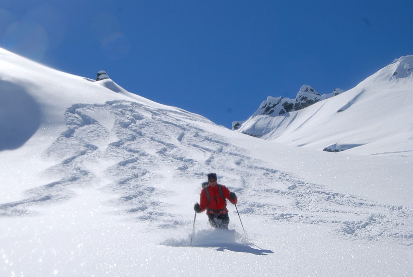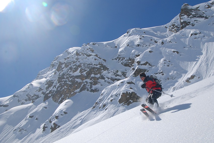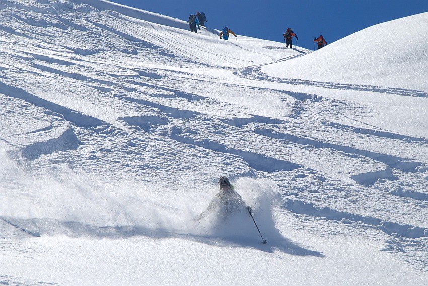 Los geht´s hinab über die nahezu unverspurten Hänge der Sonntagsspitze