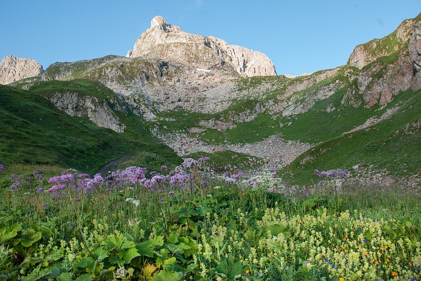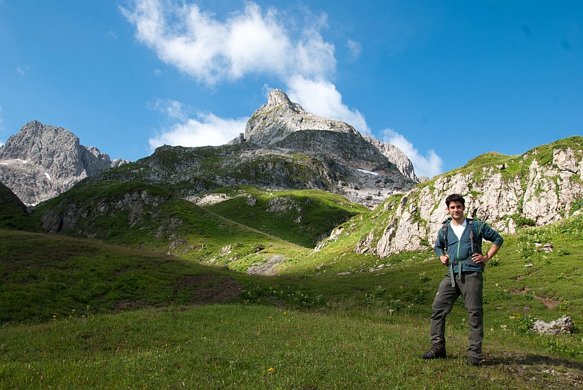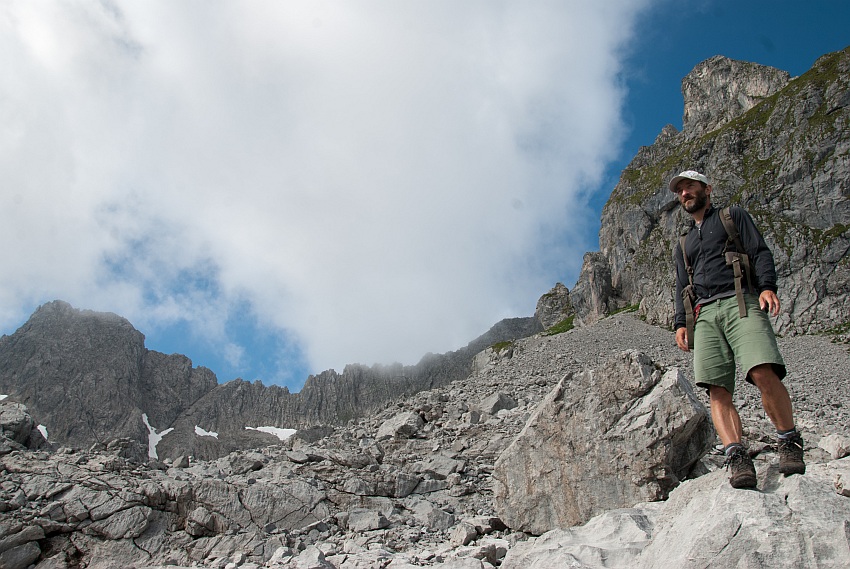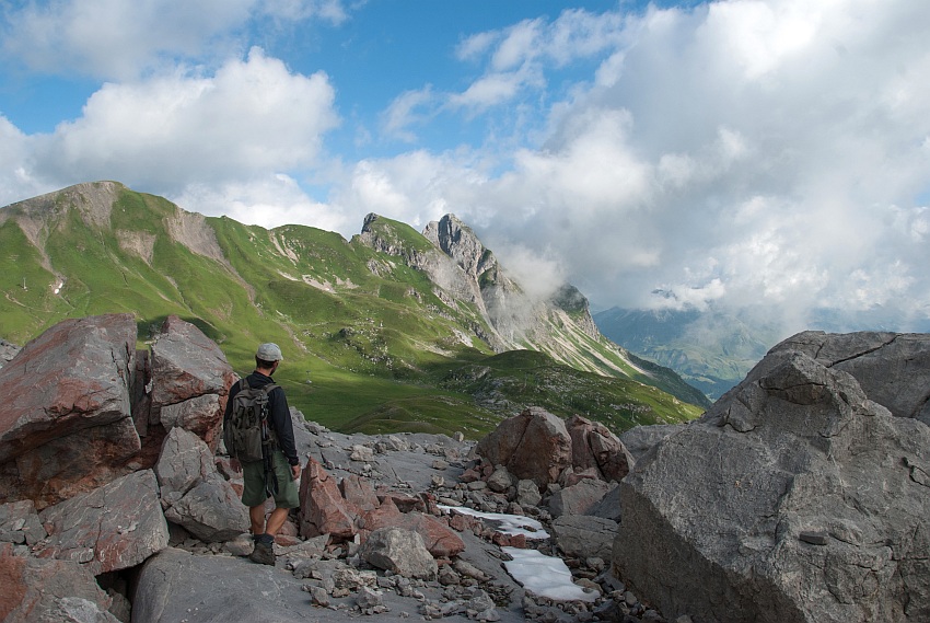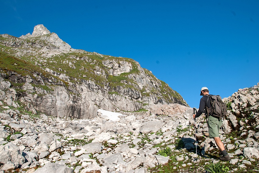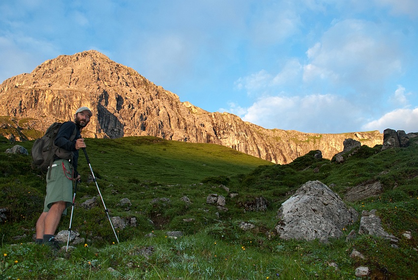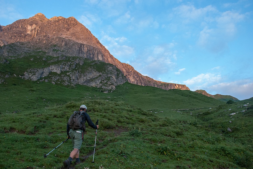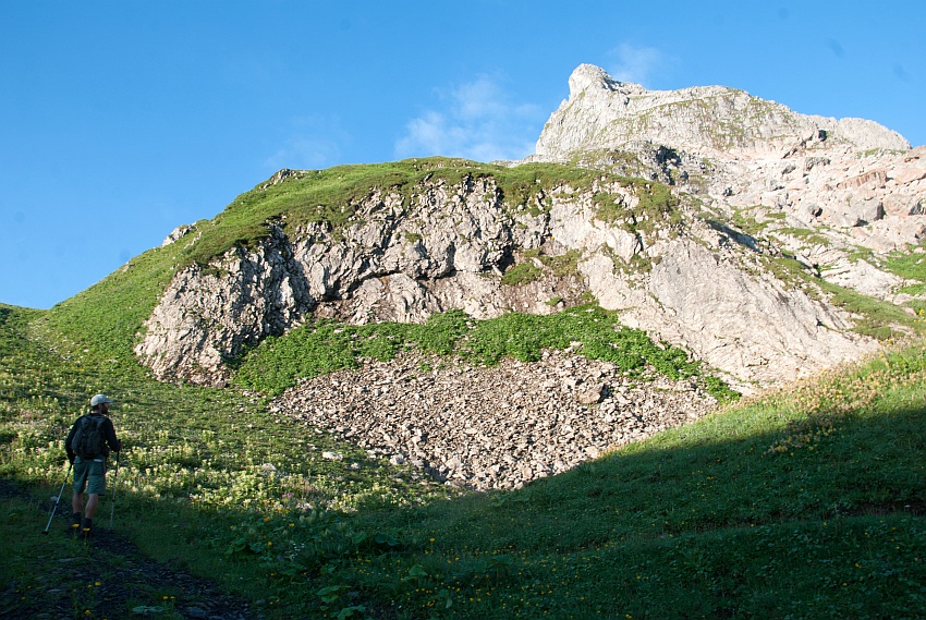 Über die begrünte Schulter gehts von links hinauf in den Ostgrat