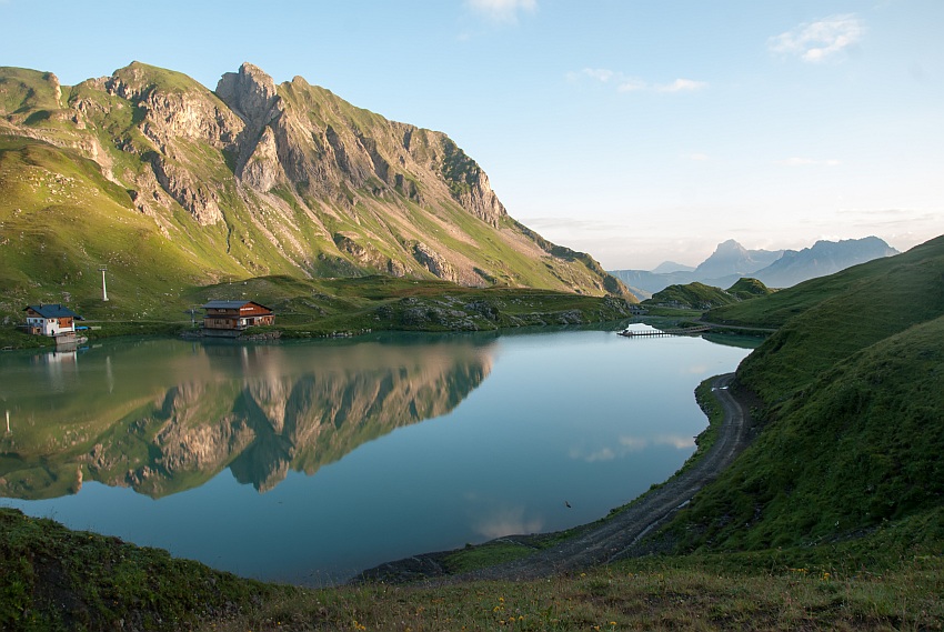 Im Zürsersee spiegelt sich die Mittagspitze und das Omeshorn