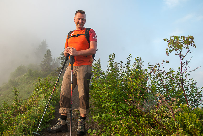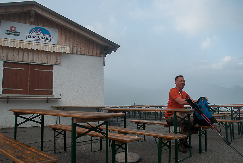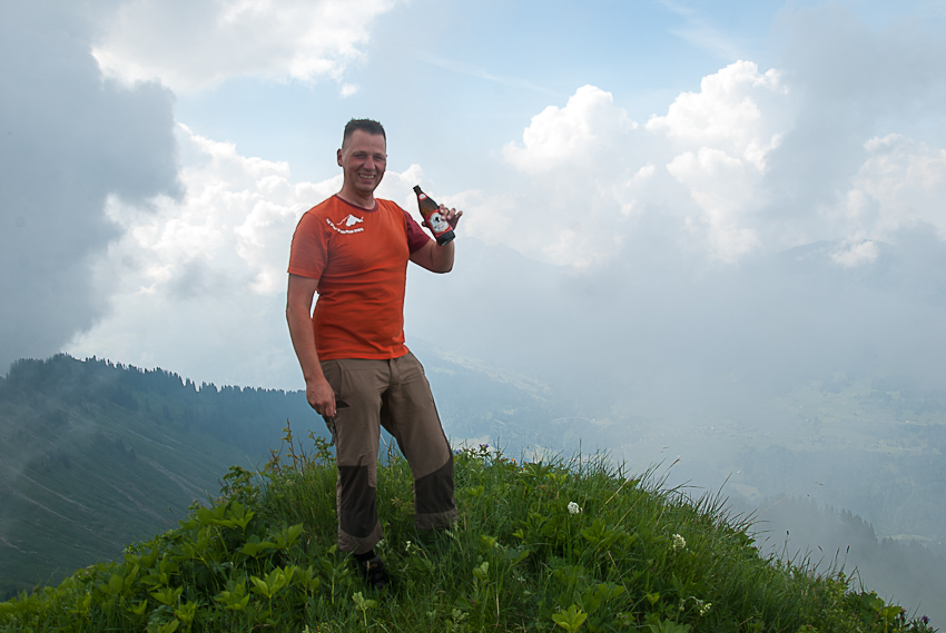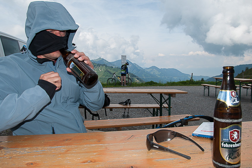 Christian mit neuer Jacke beim getarnten Biertrinken nach wunderbarer Grattour