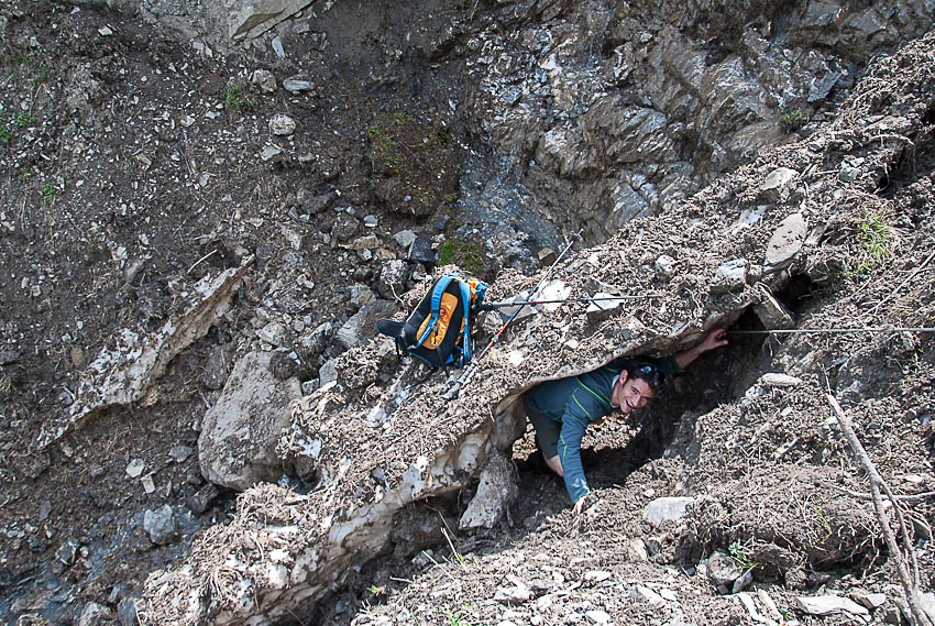 Ein flattriges Stahlseil hilft moralisch beim Abstieg, allerdings sollte man nicht zu viel Vertrauen in dessen Verankerungen setzen