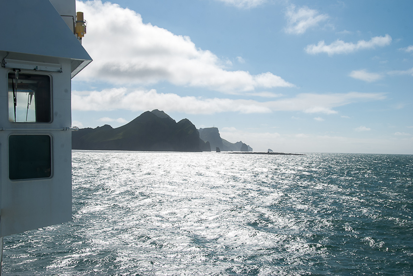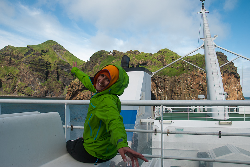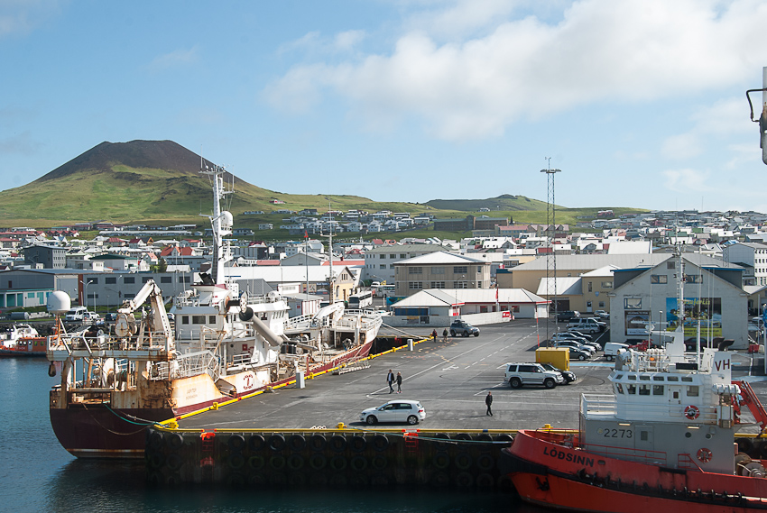 Ankunft in Heimaey. Der Vulkan im Hintergrund hätte im Jahr 1973 dem Hafen fast den garaus gemacht