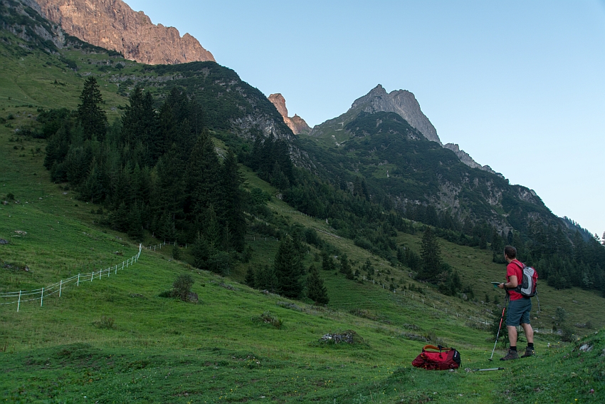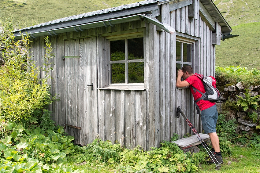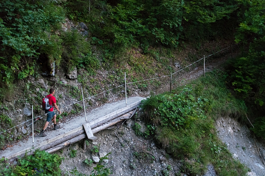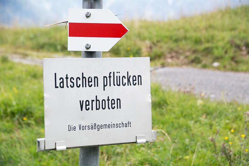 Nach der ersten Kehre des Weges zur Biberacher Hütte zweigen wir rechts ab, und folgen dem kleinen Steig hinauf zur Schiedlenalpe