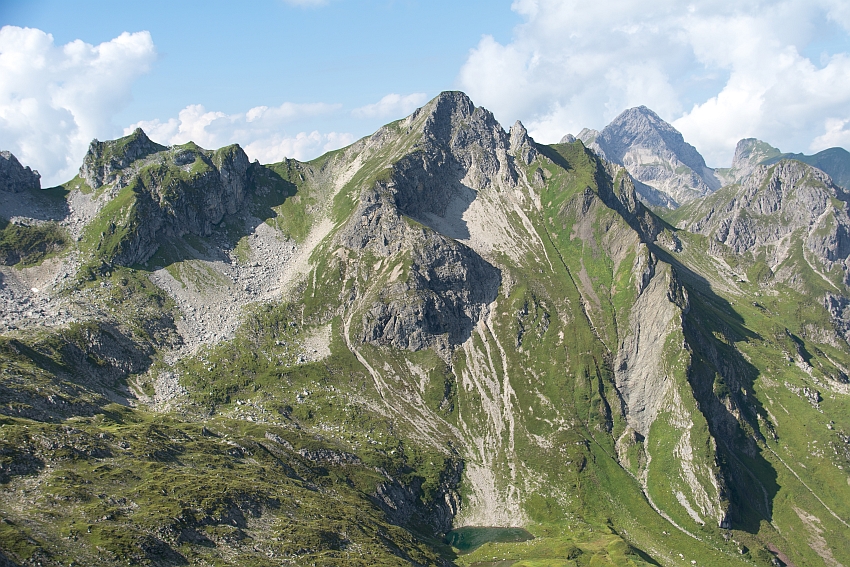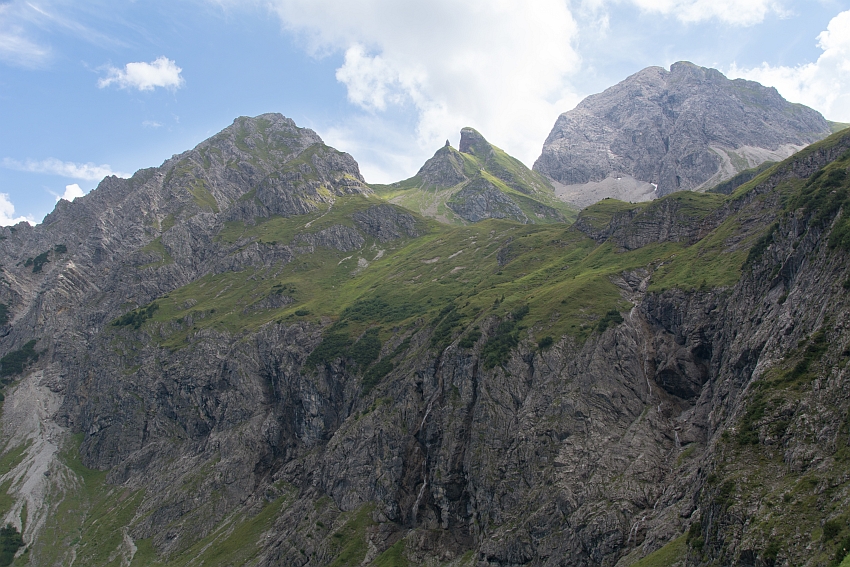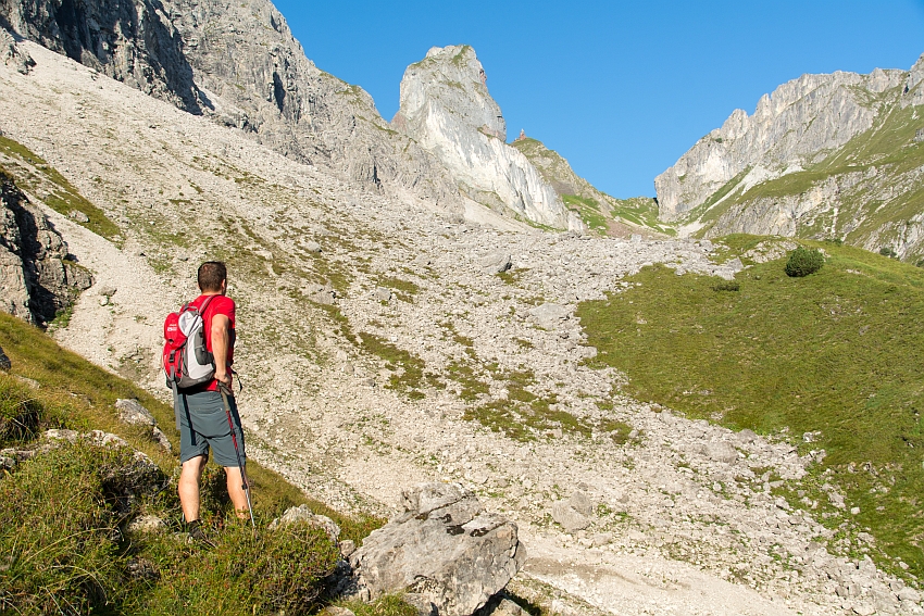 Schön zeigt sich hier nochmals die Aufstiegsroute zum Künzelturm: Vom Joch rechts des kleinen Felszapfens,