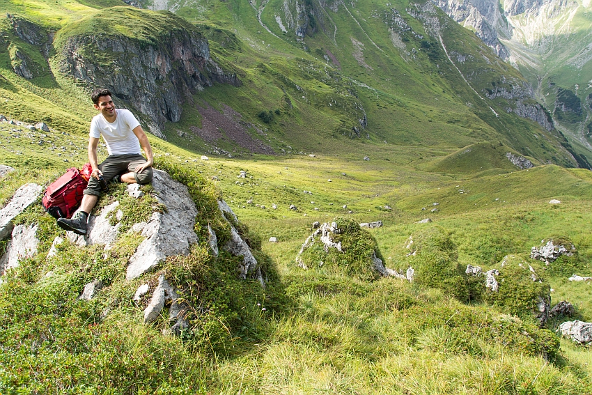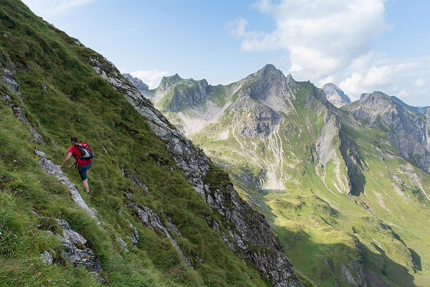 Nach der Querung oberhalb des steilen Grashangs erreichen wir das Kar,