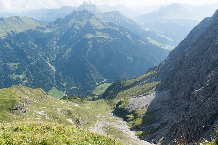 Blick hinab zur Schiedlenalpe mit der Aufstiegsroute durch das Kar