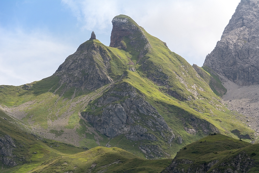 Die Hang hinter dem markantem Felsturm sieht steil und mit viel Phantasie auch nach Gratlücke aus,