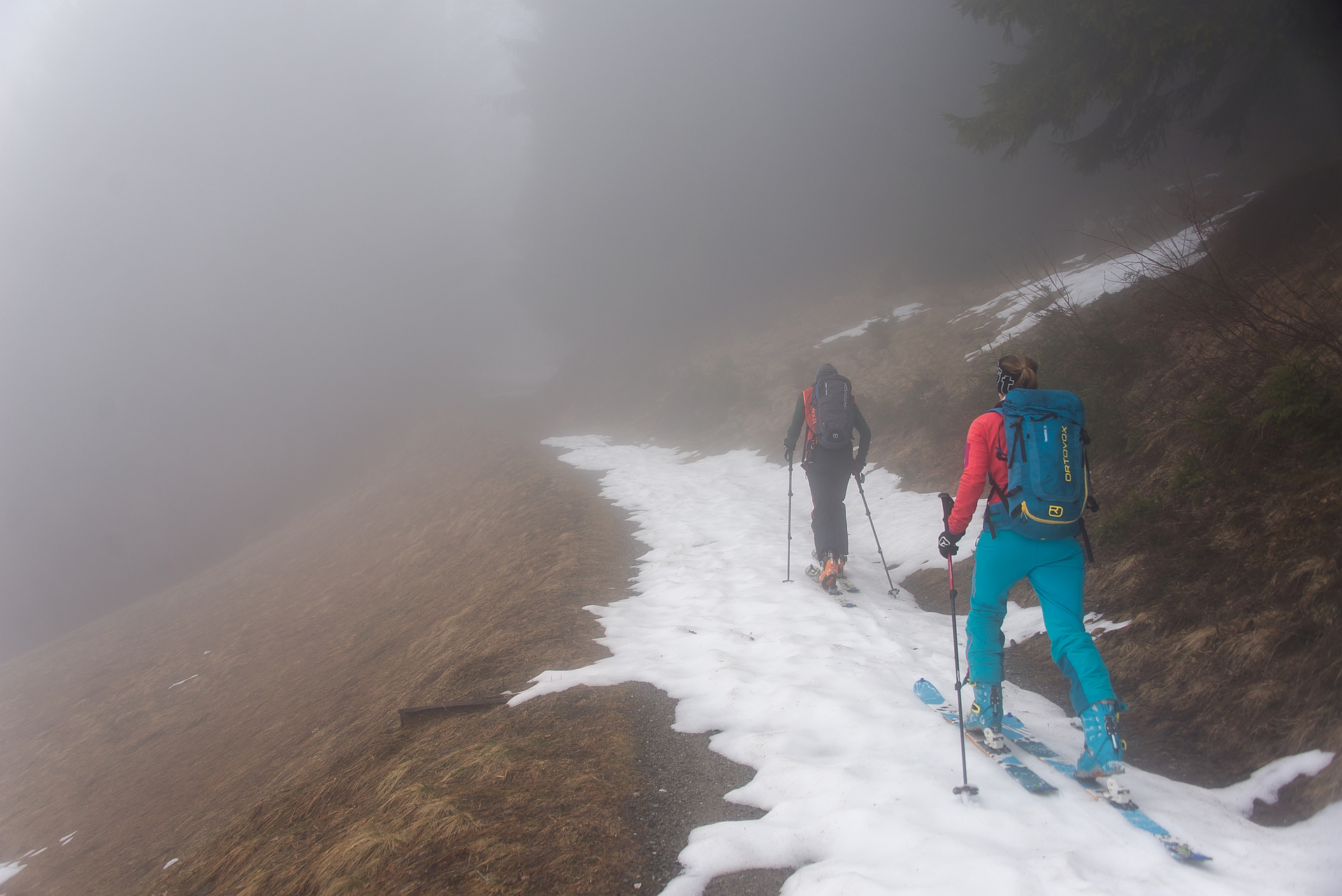 By fair means, somit ohne Bahn, wagten wir frohen Mutes den Aufstieg entlang der Skiroute hinauf Richtung Bergstation
