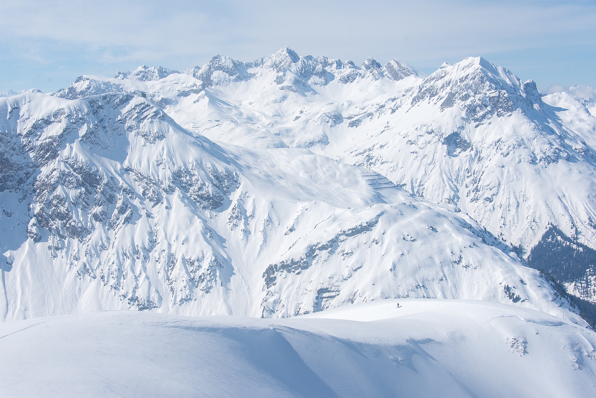 Im Westen zeigen sich die höchsten Gipfel des Lechquellengebirges, allen voran die Untere Wildgrubenspitze