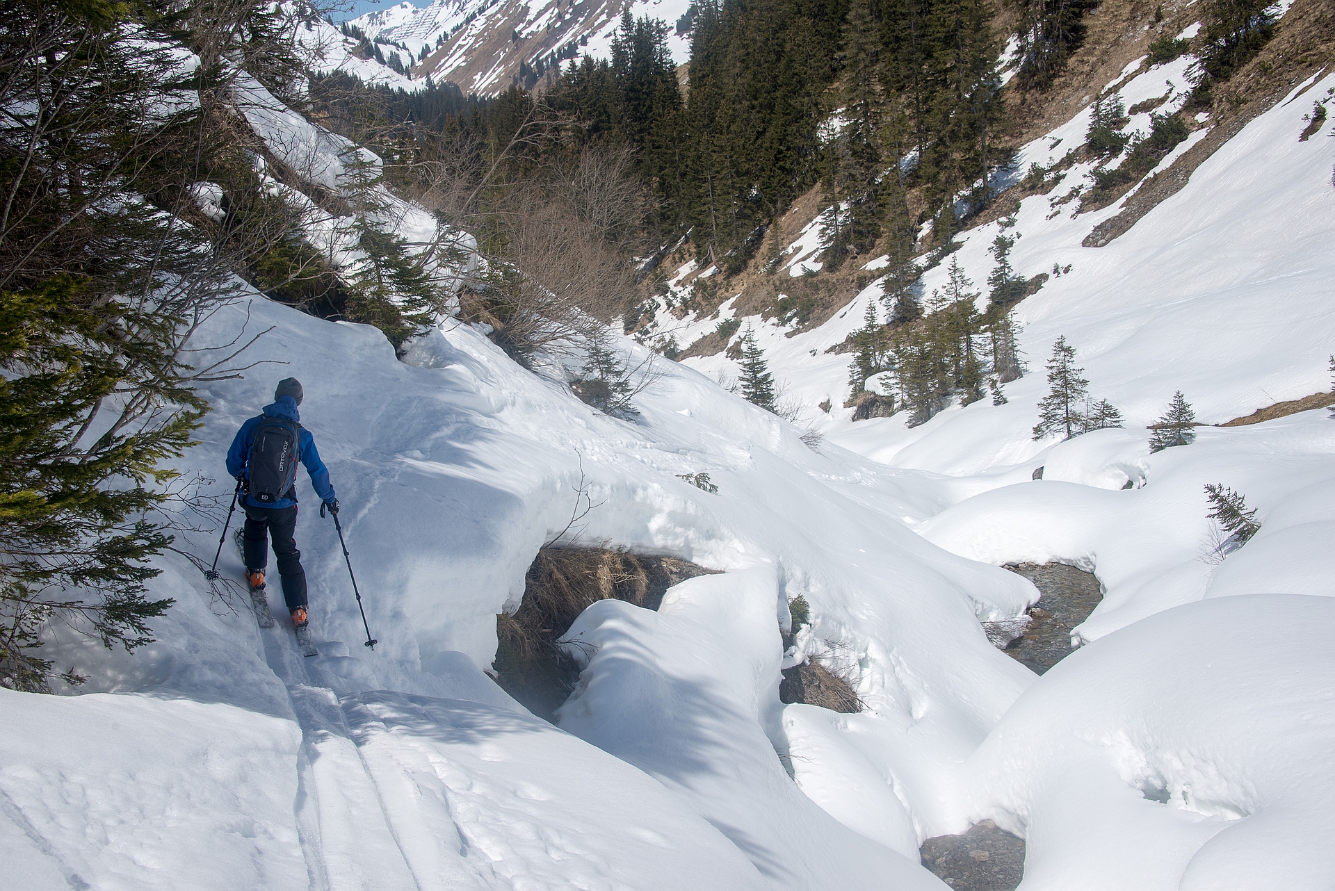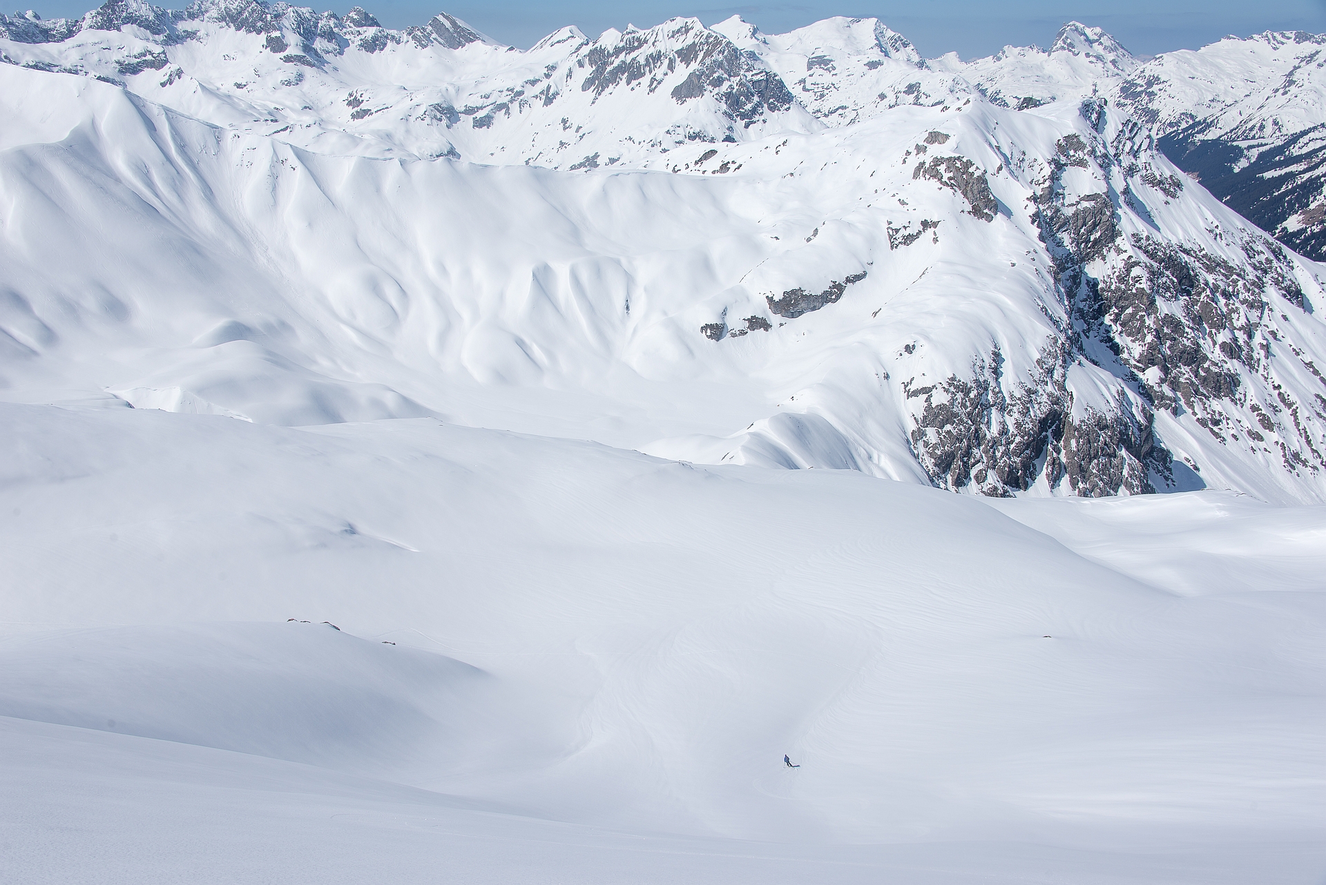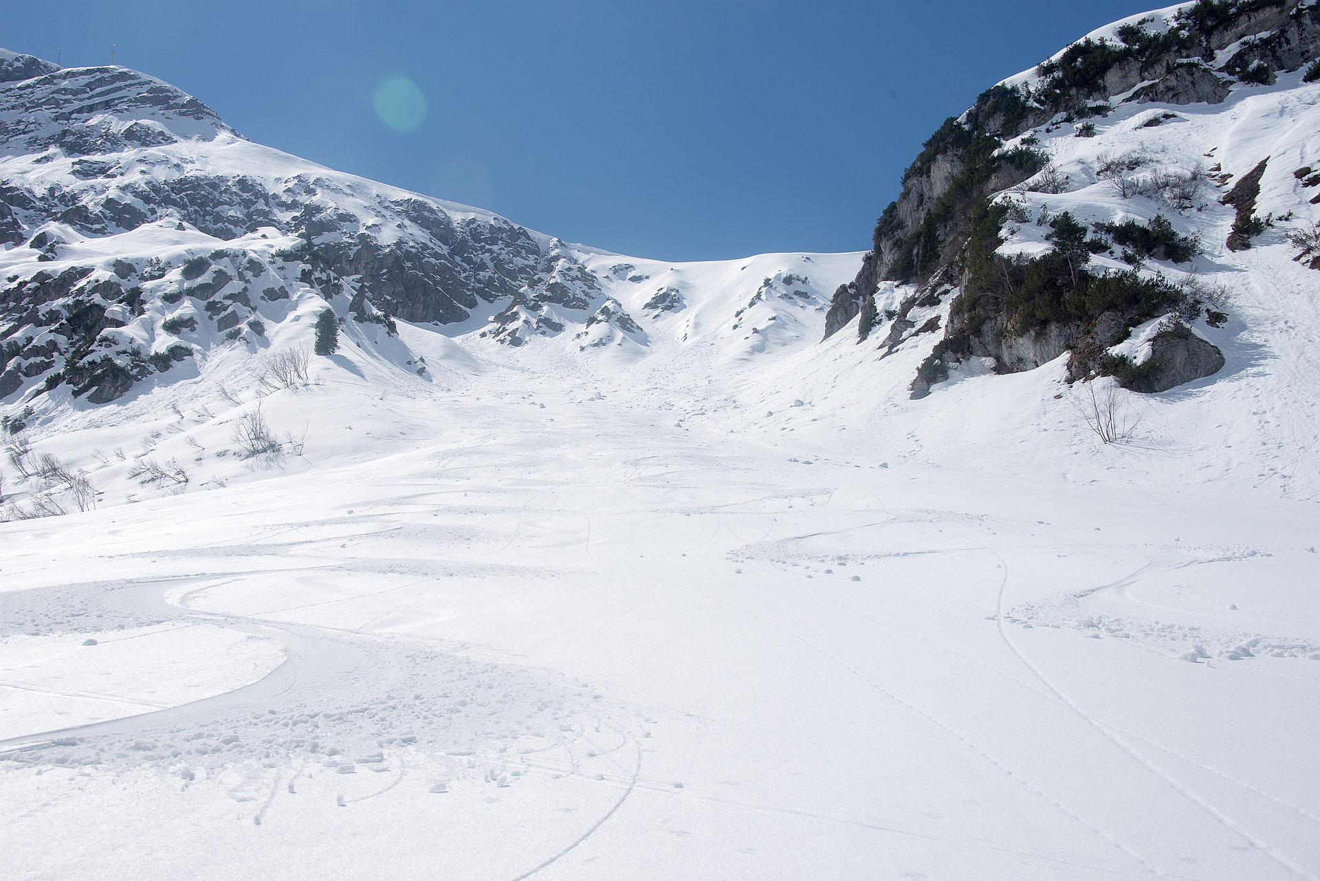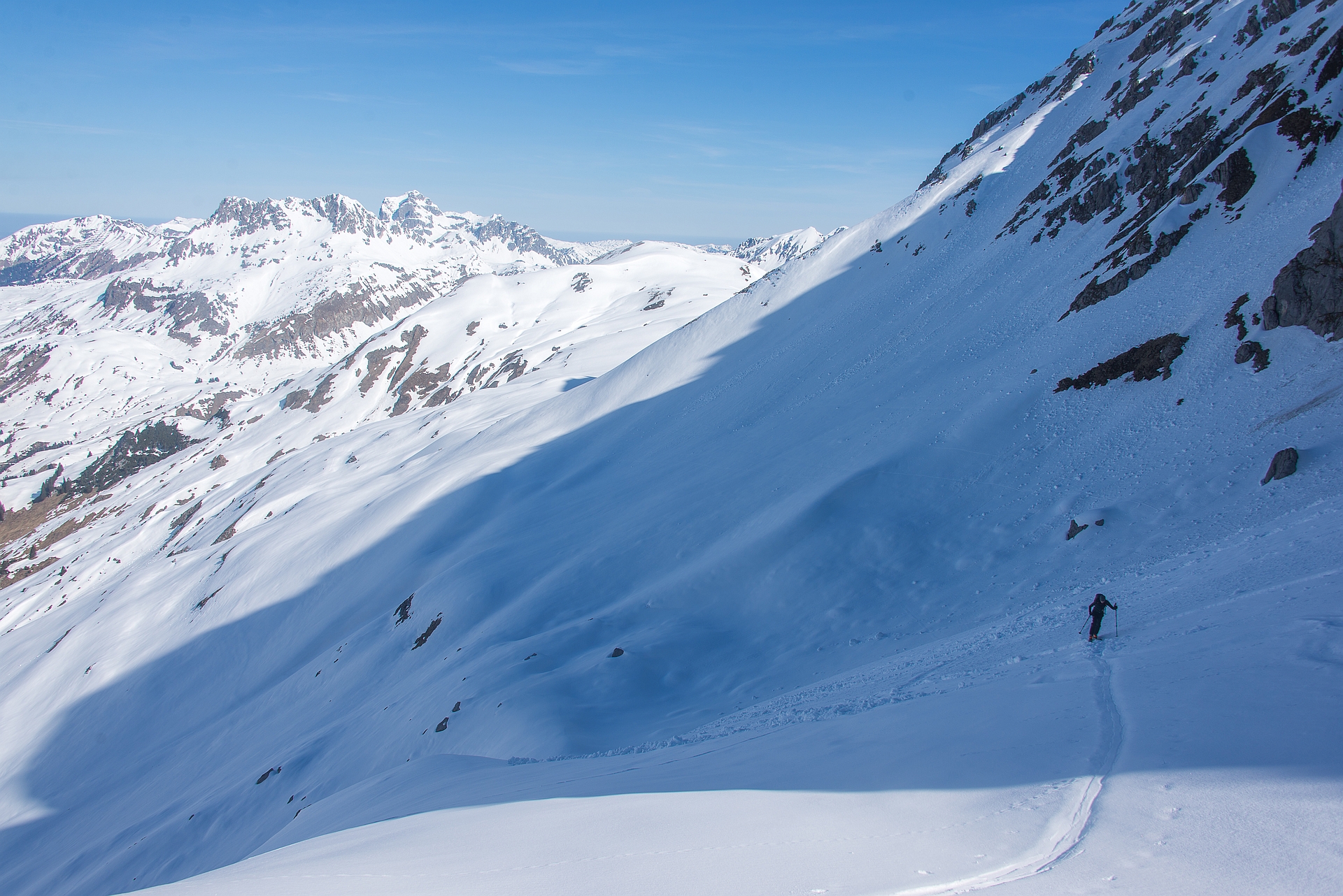 Nach einer kurzen nordseitigen Abfahrt vom Rüfikopf gehts hinein in die steile Rinne, genannt "Langer Zug"