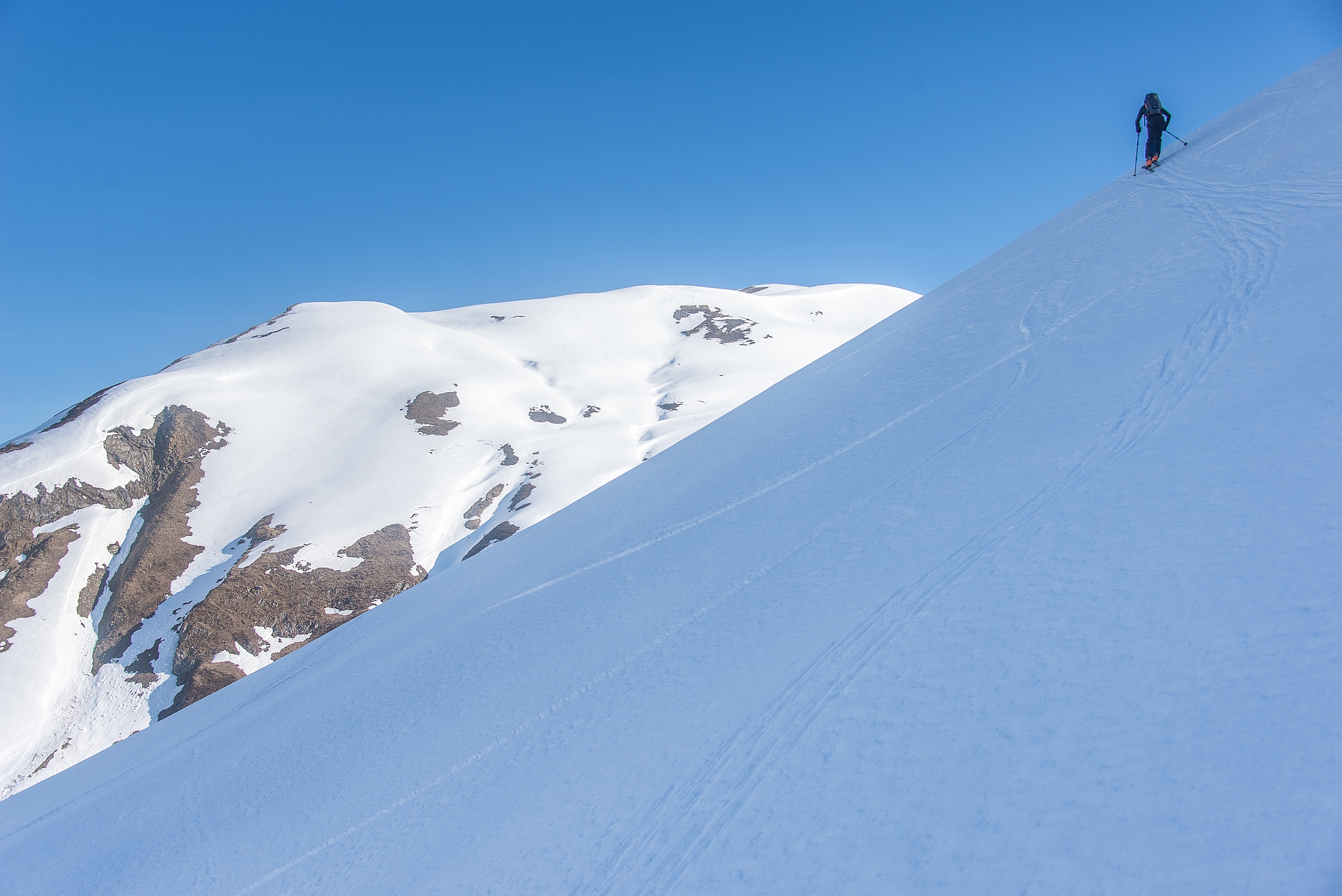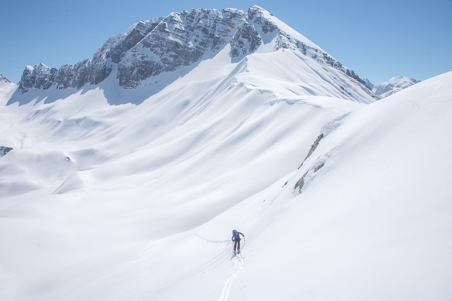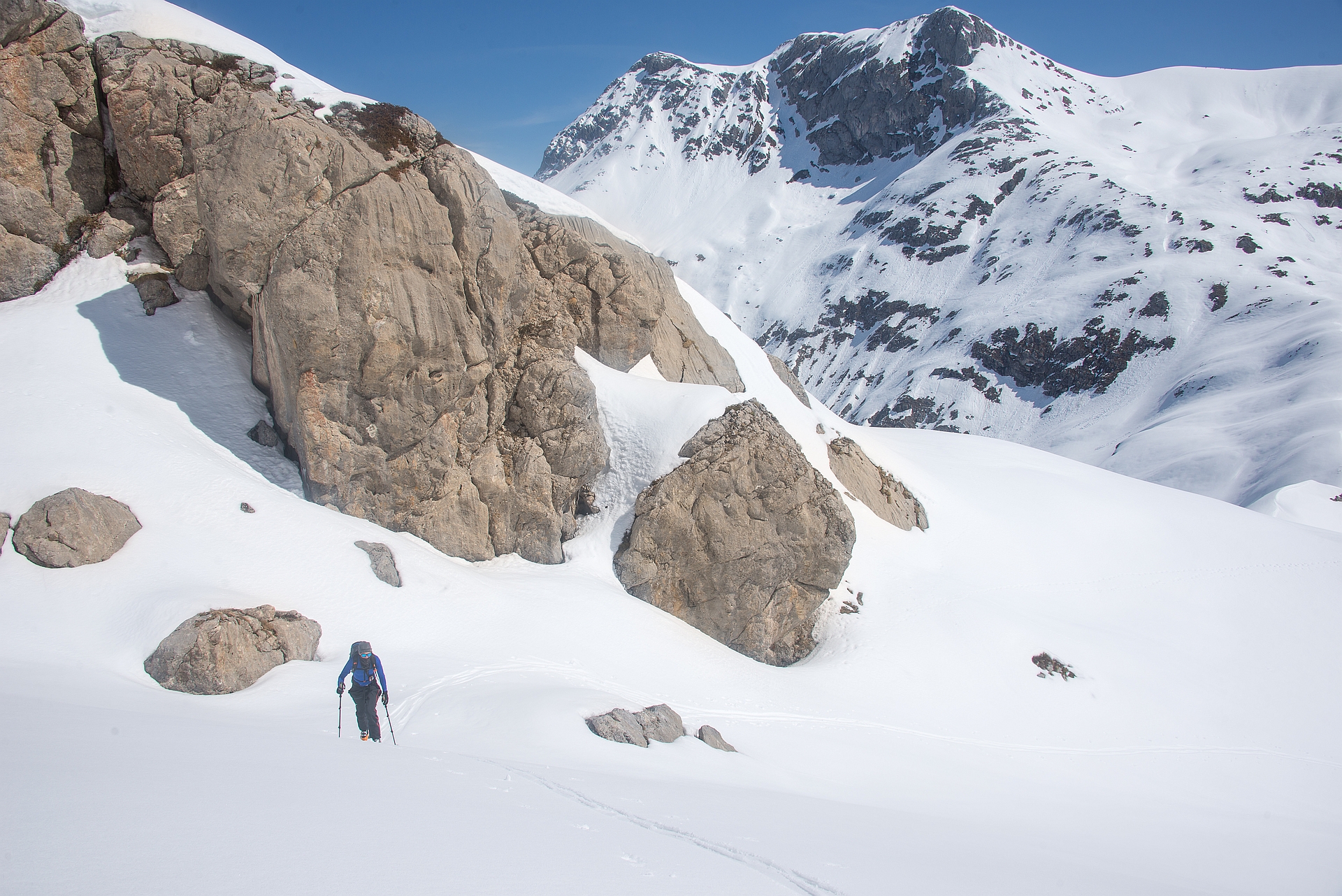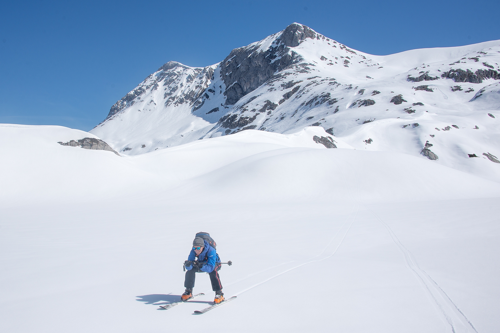 Nach einer kurzen nordseitigen Abfahrt vom Rüfikopf gehts hinein in die steile Rinne, genannt "Langer Zug"