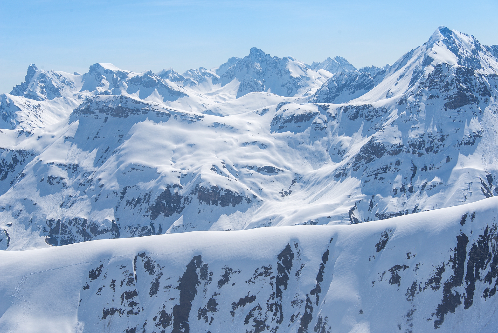 Oben angelangt gibts zur Belohnung wiederum einen beeindruckenden Ausblick auf die noch tief verschneite Berglandschaft